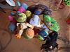 | Katy was helping me size some new bow designs today. Later it was such a pretty day we went out and started finding all the toys she has buried in the back yard, see the stack we found. |