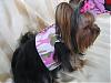 | Next we have Kayah in a pink camo harness, and again the pink korky bow Harness- yougetthesmiles Pink korky bow- Sassy Pup Followed with her very own custom made Bears Dress Kayah wore for the Superbowl Made By yougetthesmiles BTW the pictures don't do justice.. the dress is gorgeous!! Thank You