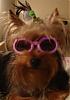 | Gracie and I went to our favorite puppy store today. Gracie fell in love with the lavender Doggles! They even have flowers on the sides. I think she actually likes them. She did not fight them at all. I about bust a gut laughing when I first tried them on her. Pardon her hair, we are trying to grow out her bangs. She looks like some L.A. Girl or something! Ha Ha Ha