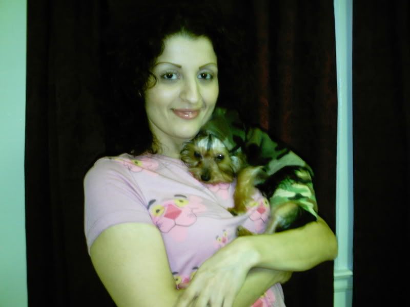 | Des, Here is Bobbi in his favorite outfit (camo hoodie) and of course MY favorite.........the belly band (insert evil grin here)...He would not pose for the camera today so he clinged to me while my friend to the pic. http://i121.photobucket.com/albums/o...Picture122.jpg