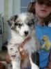 | Okay, so she's not a Yorkie but we love her and Tatum is starting to give in a little too. She's a blue merle Australian Shepherd. Some of you may remember me seeking name help. We were going to get a red merle but this one was so much prettier that we got the blue instead. She's almost 8 weeks old and although she looks quite fat, she weighs 5.4 lbs as of yesterday. Won't be that small for long though! And we didn't even go with a "western" name like my husband originally wanted. After throwing many names around, we finally ended up with Stormie......