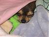 |      Need some ideas please.  My little rescue Chihuahua, Kozanna, is doing fine, but has no potty manners, of course.  She weighs not quite 4 pounds.  I got her some panties and they fit her OK, but won't stay on.  They slide right off!  She is pretty slick with short hair and although the panties fit her, they don't have anything to keep them in place.  Her hips aren't any bigger than the rest of her.  Any suggestions?  I've thought about trying to make her some panties out of a sock.  I have a pattern for making a sweater out of a sock, but not panties.  Might use a tube sock and use the toe to cover her bottom and cut holes for all 4 legs and turn the top down for a crew neck.  She doesn't need any opening for her tail (she doesn't have a tail) and she needs complete bottom coverage for peepee and poopoo.  If she gets scared, she might poopoo as well as pee.  She's curled up on the couch right now, wrapped in her blanket and snuggled down in a big, soft throw.  She got a snazzy new pink sweater for Christmas and some new toys.      |