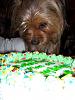 | YT Addict |    Thank you everyone for the B-day wishes! As promised here are some pics... #1: Emmett and the cake I got for him... even though I ate it and he got some doggie cookies... haha. #2: Emmett eating his cookie. He looks a bit crazed. #3: Emmett and his new stuff! #4: Looks like the rainbow fish is his new favorite!!! I took a video too... but it was too dark. Boo. Happy bday Emmy!