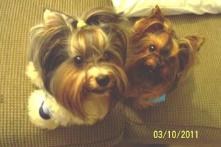 Jada our Yorkie girl is 4.5 years old and weighs 6lbs 8ozs Bogie our Biewer boy is 2.5 years old and weighs 8lbs http://i741.photobucket.com/albums/x...3/100_1761.jpg |