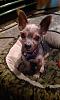 | Well, I thought of Scrappy Doo, Scooby's lil brother, and while he's not fiesty like the original Scrappy is, I felt it was appropriate since he was a stray. I think all animals who survive as strays are tough, and that somehow he survived proves he is strong, even though he is tiny. I have one of Smokey's shirts on him, that I forgot to send along with his forever family, and Scraps is SWIMMING in it! It looks like pjs on him. Plus, if anyone remembers, Scraps is the name of Victor's dog that has passed on in Corpse Bride, which is one of my favorite movies. So I go between calling him Scraps and Scrappy. He still doesn't know either LOL. But since he has bad LP, he doesn't jump, or even try, and he can't do stairs, so good thing he's not so clingy, he didn't cry to sleep up on the bed. I'd be afraid he'd wander off the edge and break a leg or something. He was totally fine with sleeping on his little bed on the floor in our room. Uni was totally fine with not sharing her bed. He even barks when he wants out to go potty!