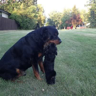 |    Hello, I have a Rottweiler who weighs a whopping 135lbs. I just purchased a yorkie just over a week ago. They love eachother. Milly doesnt like to go outside unless Tank (my Rottweiler) is with her. They play together all the time. Maybe I am just lucky to have such a gentle giant. Milly tries to get into Tanks mouth while he eats, jumps at his tongue while he's panting.   . Still, he has no reaction to it. Just turns his head back and forth to get away from her...lol. Here are a couple pics of my little and not so little babies. http://i1254.photobucket.com/albums/...4/c01b28e3.jpg http://i1254.photobucket.com/albums/...4/c78e7969.jpg Just wanted to share  Shelly |