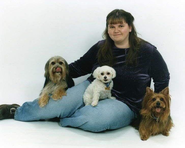 I'll try to post a couple pictures here through photobucket. This is my yorkie, Ted and a pic of my three dogs with me. My little maltese is 7 pounds and the yorkie mix is 18 pounds. http://i23.photobucket.com/albums/b3...2-14-05Ted.jpg http://i23.photobucket.com/albums/b3...stiandDogs.jpg