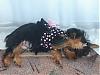 | She is so cute in her new dress. My dogs try to hide from the camera too. LOL