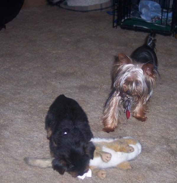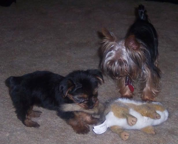 | YT 2000 Club Member | I just wanted to let you all know that Jeter LOVES having Axl home. They play so cute together! I was worried that Jeter would be mad that we brought the puppy home but He liked him at first sight. I have a bunch of picture's of them playing together that i will have to share once I down load them ![]() His vet visit went great. He was 8 weeks old at the appointment and he is 2 pounds. He got his shots and did not yelp at all! ( Jeter is 10 months old tomorrow, and he is 2 pounds 8 ounces) He is very friendly but he is a nipper, he acts like he is going to kiss you up but then he gets your lip I offer him a dental bone or chew toy when he does that.I am just so so happy to have him home I have 2 weeks till Yumi Yasha comes home and I just know they will all get along fine!