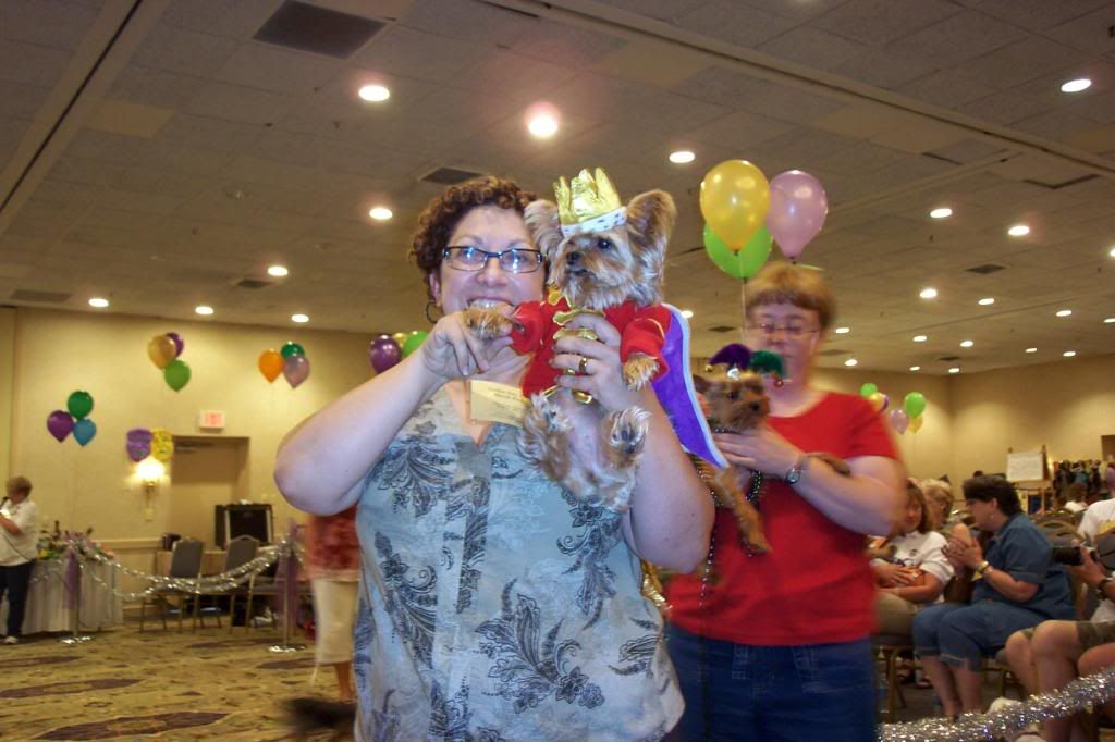 | I just got back, it was such a great event! I've never seen so many yorkies in the same place, and all for such a great cause. Eventhough they didn't get through all of the contests since they were running long, you could tell alot of hard work was put into this event. I really hope SAY, raised alot of money from this event to continue to help more yorkies in need. One contest we did was the "Biggest Yorkie", eventhough Chip weighs more than Harley - Harley was tied for first with his brother from another mother. Seriously, Harley and Kipper (the other winner) looked like twins. All the winners recieved a small trophy, and a can of Wagatha's treats. We also participated in the Rescue Parade, over 50 dogs at the event were in it. Some of the stories were so heart breaking it took alot for me not to cry. I saw a few other YT'rs there, Amy & her fiance w/Diddy and posh, Nancy w/ Gus, Lorrie w/family of pups, and Diane w/Murphy who I carpooled with (Thanks again for driving Diane ).First pic is Harley and his twin Kipper Second pic is Murphy before the Mardi Gras King contest