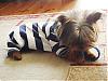 | ah I'm the lucky one! I just can't imagine (even more now) that someone would dump a pure bred yorkie and such a loveable one too. I think he might have been dumped from a car as up to a couple of weeks ago he would shake in the car and then promptly throw up once the engine was turned off. He's gradually getting better but will still cower if he knows he's going to be travelling by car. Here's another pic before his hair was cut, I had him in my ds's babygro as he was licking a sore bit from his neuter op.