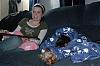 | He doesn't like it when Charlotte invades his sleeping space, yet. So I waited until he was halfway gone and let her get comfy. I doubt he knows she's up there. That's Brooke in the photo. I asked her to give me her evil smile... |