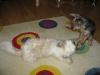 | Here's some new pictures of Sango playing with Dolly my boyfriend's Shi-tzu/Maltese mix pup. Check out Sango's super ninja dog gravity defying moves. Look at those ears!! She's a natural, just like Dumbo! |