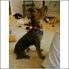 | Buffalo is 5 months old and got his second hair cut yesterday! I found the groomer in the phone book and she is great! only does things by appointment and she does a great job! She does not use the neck tie to keep them in place, everything is open and i was able to sit there and she talked to me while she groomed Buff right in front of me. Needless to say since he is so young she had a bit of a rough time but was sooooo good with him! check out the pictures. First and second are before pictures of him getting his belly rubbed and flailing around lol, last two he posed for. In the last one you can see his crystal letters that spell out his name on his collar... cute huh? ![]() ![]() ![]()
