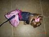 | Hi, have been wanting to share this with my friends here at YT. The wkend of 7/19 Jazzie celebrated a Year Anniversary with ME & her Family! To celebrate we went to the dogshow in Houston and met all our YT friends. I made Jazzie a very Adorable dress to wear on the Saturday, Denim top with the word PRINCESS in Bling, there is a cute crown on top of one of the letters, the skirt has a print of crowns, castles, wands, so cute. I made a matching leash with a little bling on it as well. I even dabbled in the art of making necklaces! and made Jazzie a faux pink pearl necklace! We had Such a funtastic time with our YT friends. This dress, along with All the dresses and vest in my album are available for your cuties. Neck 7" up to 10" Girth 10" up to 14" or so Length 9" up to 14" Dresses $18.00 + $2.00 shipping, boys vest $13+$2.00 shipping, necklace $6.00. Sales of these items go towards Jazzies femur & luxating patella surgery.