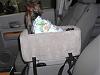 | I thought I would post pics of Bailey's new Console Carseat that we purchased from G.W.Little, but I will be returning it shortly for the Black which I think will look well in our SUV.....The pics don't show the true color of the carseat (the flash didn't help either) its more of a "dirty gray" color...in contrast with my seating in my car the carseat looks filthy on the side of it I guess because my seats are a light/medium gray.....What I really think is the black lining in the print may make it look a lil less grayish......I dunno but I think I will be happy with the black once it gets here. Anyway it fits PERFECT in my SUV (glad I didn't go with the SUV sized one ) it is very compact so if they say its meant for dogs up to 5lbs they mean EVERY BIT of it LOL Bailey is not even 4lbs and he fits PERFECT...With Bailey being long I don't think he can lay directly in the carseat because its too small but he can maybe lay and put his head on the edge.....I love IT!!!! Just not the color