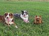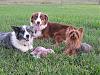 | Okay, so if you can excuse the lawn that needs to be cut and the scruffiness of all three dogs (seriously, they were ALL a mess!)..... They were all playing together so I just grabbed the camera. It's pretty hard to make everyone pose just right but I got a few good ones. Stormie is the blue merle Aussie. Blaze is the red Aussie (son of Stormie). The last one is Tatum at her usual.... bossing (yapping) at the other two. She likes for one of the big kids to run around the yard with a toy so she can chase them!