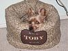 | I found this bed on eBay and since Toby loves to burrow down in a ball and sleep I thought I'd give this a try. I ordered it last Friday, the lady made the bed and embroidered the "name plate" and it arrived today. I have to say this is a really nice bed and the price was in the price range I was looking for. I was very impressed with the quality of the bed and the lady that made it answered all my questions via email in a timely manner. It is a small bed because when Toby lays down in it and curls up, there is no room for anything or anyone else in the bed. She makes oval ones as well. When you click on the website, scroll down to the donut beds. She has a LOT of different fabrics to choose from. Custom items - Get great deals on Dog Beds, Embroidered items on eBay Stores!