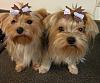 | HI, everyone! Meet Brody and Mia ! Brody - Blue/Tan - born 3/21/10 - weight 6.3 lbs. on 5/14/11 Mia - Golden - born 3/16/10 - weight 6.0 lbs on 8/27/11 Brody is 1" taller than Mia, who just has shorter legs than him, but they are the same length, same neck and chest size, and only a half inch difference in hip size separates their measurements, so I just tuck one under each arm and off we go ! Mia's tail was docked way too short, and I just love Brody's un-docked, European-style tail ! Actually, any docked tail (clipped ears, or any other body part) is cut too short...but that's just my opinion...I believe such details should be bred into the dog...I do not approve of not in cutting the dog down to fit the desired size and shape ! Whatever, huh ? ;-) Brody and Mia are perfect companions for each other. We got Brody first, then we babysat an ex-show puppy Shih Tsu, a few months younger than Brody, about six (6) weeks later, and the two (2) puppies had so much fun together that after she went home he would go and lie down where her kennel had sat, looking sad and forelorn....his little chin flat on the floor, looking up with those adorable little sad Yorkie eyes peeking up through the top knot 'escapee' wisps of hair. So...I went online looking for, and found, another Yorkie, a female, Mia, who was looking for a new home, as a companion for Brody. All creatures need friends of their own kind...and we couldn't be happier ! ;-) Incidentally, Sunny, the Shih Tsu, had so much fun here with Brody, that she managed to bolt and pull away from her mommy...twice, as she was being taken out for walks...to chase blue pickup trucks like ours down the street...scaring her poor mommy half to death. She is such a love and, while her own mommy says she cannot get good photos of her, Sunny deliberately poses for me to take photos of her any time I ask her to...or when she sees my Blackberry smartphone camera pointed at her....she's quite the little ham !! She also leaped off a counter, where she was being groomed, when I entered the room, trying to get to me...I think she knew she was going to gt to go to 'puppy camp' and play with Brody again. Luckily, she was not injured, and after our hearts...her mommy's and mine...started beating again, and we were certain she was all right, we were okay, too. Both Brody and Mia are very silky and incredibly shiny...very smart, sweet, devoted, and loving, whether they are in your lap or tracking and digging up critters in the yard. Mia lost all her black when her coat started changing, and Brody's coat colors are still evolving and changing, and I think his colors are just gorgeous. Both get raves and compliments from all who see them. One lady, who saw them immediately after I picked them up from the groomer's said, "I'll take one of those. Now, which one? I'm not sure I could choose..." and neither could I ! ;-) Both Brody and Mia were clipped very short when they came to live with me. Brody was in a "Puppy Cut" but his ear tips didn't appear to have ever been clipped...still had the full range of black to silver to blond...so I tipped them because I couldn't stand to see his ear hair hanging into his food. You also could not see his eyes at all, but I've pretty much remedied that as well. Mia was in what I have lovingly referred to an a "Dumbo Cut"...real short body hair and long ear hair on the tips that was shorter near her head...but not as long as Brody's was. Disney's "Dumbo" looked good with long ears, and I do like the Puppy cut, but, while Mia and Brody are cute no matter how they are clipped, I can hardly wait to see them in full coats. Mia's former Mommy said "Mia won't wear a top knot"...and I am pretty certain Brody never had one either...but I think my 'Little Boy Blue' Brody and my 'Goldilocks' girl Mia look 'fairy tale' adorably gorgeous in bows. Prejudiced !! Me ?? Perish the thought !!! ;-) In the photo with Pink and Blue bows, they had just come from the groomer, Tenille (hope I spelled that right!) at My Yuppy Puppy (MyYuppyPuppy.com), a terrific lady who does a great job with their mini-cut/face/paw/ear/etc./mini-trims, but the Pink and Black, and matching Brown/Lilac bows were just after I had given them their regular bi-weekly baths. I take a lot of photos of them...you probably didn't know that ! ;-) Both of these beautiful Yorkies had previous homes, but needed the kind of love, attention, and devotion ONLY a totally little-finger-wrapped, Yorkie lover can provide...and we are eternally grateful that we were allowed to take over loving and caring for these charming little babies. Sorry it took so long for my introductory post. I never got an email to validate my account with...and I couldn't figure out why I could not view the photos you folks have submitted...so I went looking through the fourm info finally got everything squared away. After seeing your adorable Yorkie babies, I just had to let you see photos of mine, too! Thanks for reading this 'book' about my Yorkie babies! Take care! - Cat |