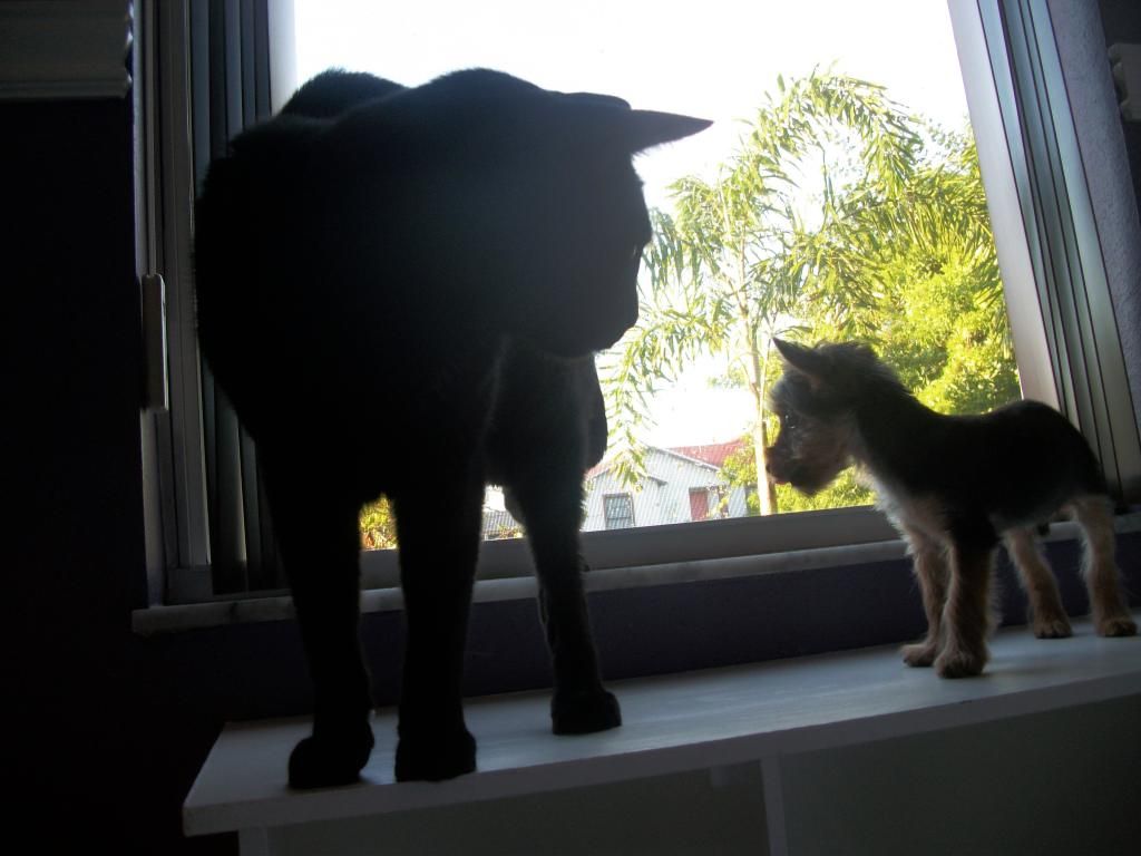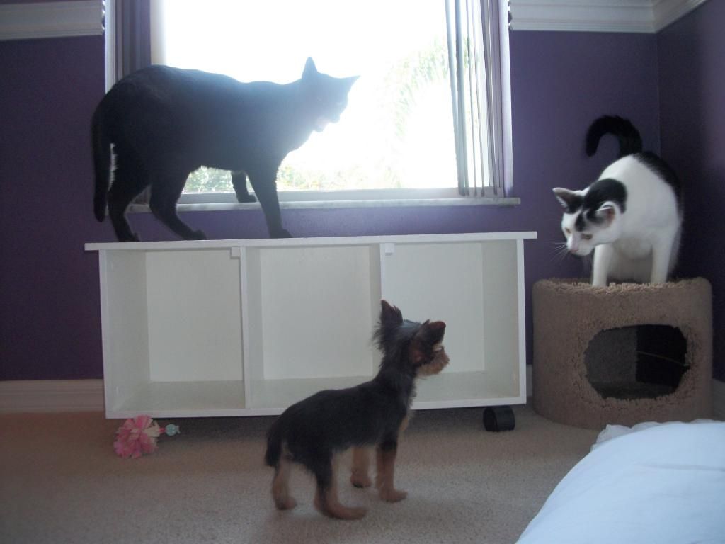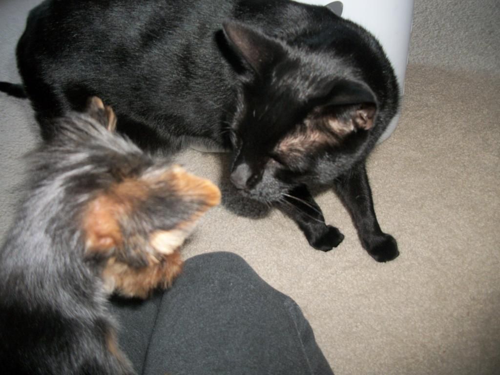 | Senior Yorkie Talker | My black cat, Patrick, seems to like Buddy now. They were playing earlier and it was adorable ♥ My white cat, Baby, however, still looks at him as if he is prey. She hates him. :l But she is a skittish cat, she came from a hoarder as a kitten, so she started out having a bad life. She isnt very trusting of anyone. But she is very open and silly to our family, particularly with me. http://i1254.photobucket.com/albums/...pseb56dd16.jpg http://i1254.photobucket.com/albums/...ps2c265c5c.jpg http://i1254.photobucket.com/albums/...ps0be2b73d.jpg