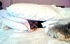 | She is giving me a run for my money. I looked everywhere for her and I was getting frantic. I knew she was in the house somewhere. Looked in every room in the house and went back to look in my bedroom and happened to notice a little dark head all snuggled in the pillows! |