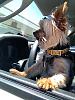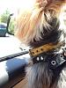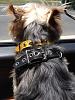 | How cute..love that color with Peanuts dark coat. Bogie has the black BB but gold wouldn't look right on his light coat so we went with a matching black collar.Peanut must be a very well behaved little poot to be standing in the front seat with no restraints..my monkeys would be climbing all over the car if they aren't harnessed in.