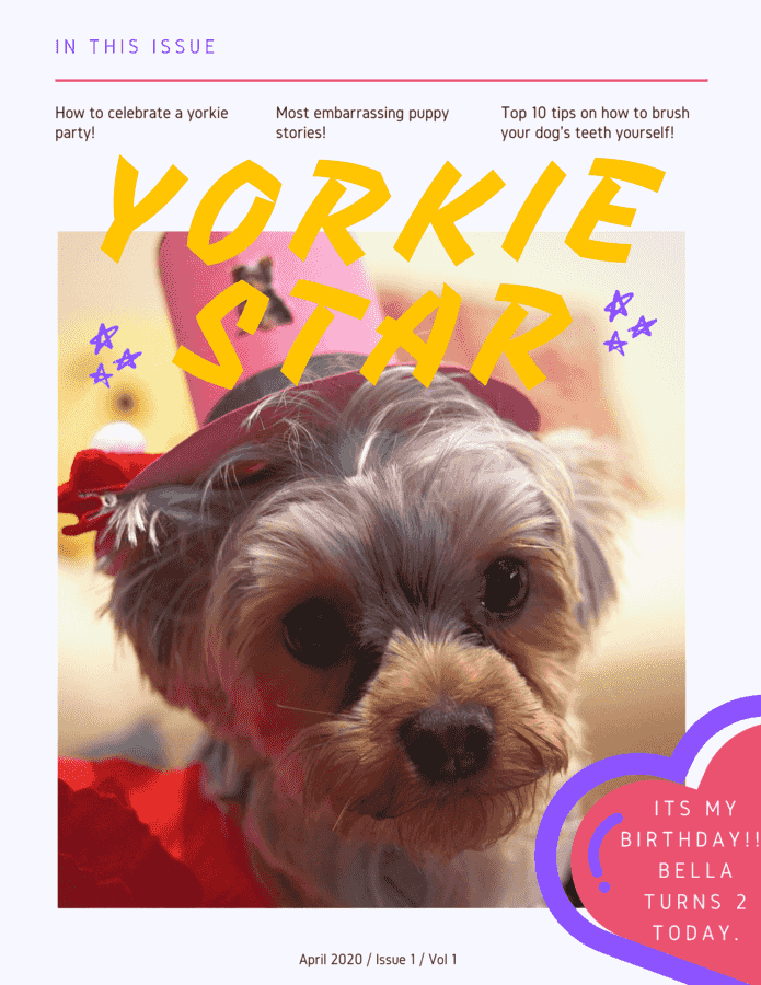 Hi I'd like to share Bella's custom birthday magazine cover our son made for her for our memories. We can't believe that time has past so fast since we got her from the breeder at 8 weeks old. We are lucky to have this wonderful experience as a first time owner of a Yorkie and first dog. Bella is obedient, sweet and affectionate, not a puppy anymore. Hope you like the pictures. Thank you.