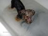| Nikko's so good in the tub! He's cleeeeeean! I love bath time because: 1. They are clean 2. They look like completely differnt dogs when wet 3. They get so fisky after towel drying 4. They look like they feel GREAT when done strutting around all proud saying "Look at ME! ME! ME!" Thanks for sharing! PS: I give my girls a bath in the kitchen sink. It's works great for me since I can stand and my faucet has the shower button.
