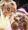 | Hello YT members ....I just wanted to show off my furbabys and show you guys how cute they look in there hoodies , also a couple of months ago i was looking intogetting a little yorkie girl and found one of our TY member that could not keep her little girl that was 4 months old ...So i was the luky one to get her anyways I've had her for about 2 1/2 months now and this will be the 1st pic's that i post of her So i would like to intruduce to you Kissesand most of you know Hershey ...If you guys have pic's of your pup's in hoodies post them so we can all see how cute they took waiting for Winter