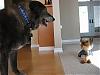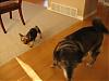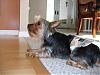 | both Here are a couple of Tiger's pictures STILL staring at Frankie and check out the last pic of Annika and Tiger together . . .Annika was barking whilst Tiger was trying to size Frankie up hee-hee.After 2 days, Frankie and Tiger are buddies . . . Annika continues to keep her distance but does not bark as often anymore. |