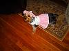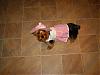 | Daisy looks really cute in her new outfit. Looks like for now at least, she doesn't like her hat too much. Daisy, you are a cutie pie.