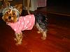 | So we went to Petco (yes MizzWanned,, I've finally found out where they were in NYC), and they have a VERY wide selection of new fashions... So we got a cute pink w/polka dots sweater and an even cuter pink coat with fur trimming.. {I could'nt get Daisy to cooperate with me on the coat pics..she was too hot in it}