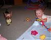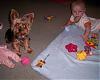 | Yes Mickey does try to take off with the baby's toys, and Minnies very pertective over the grandkids , she will growl and try and get them back from him. but he loves it cause the chase is on. lol The kids love watching the dogs chase each other. lol by the time I get the toys back they have to be washed. lol But most of the time when they see me getting down on the floor to play with the Grandbabys , they run to their toy box and start digging out all their toys . So I sit and play with all 4 of them. lol |
